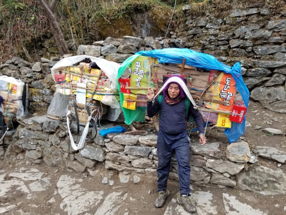 All of the villages above Lukla, our start point, are solely supplied by porters carrying incredible loads supported by a strap around their forehead, and various yak or donkey trains. It is humbling to see these porters carrying tremendous loads, usually wearing sneakers or sandals, speed by you as you are climbing the same trails.