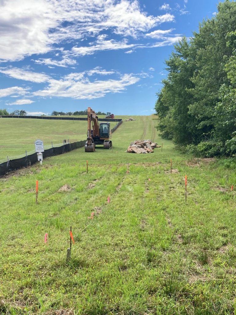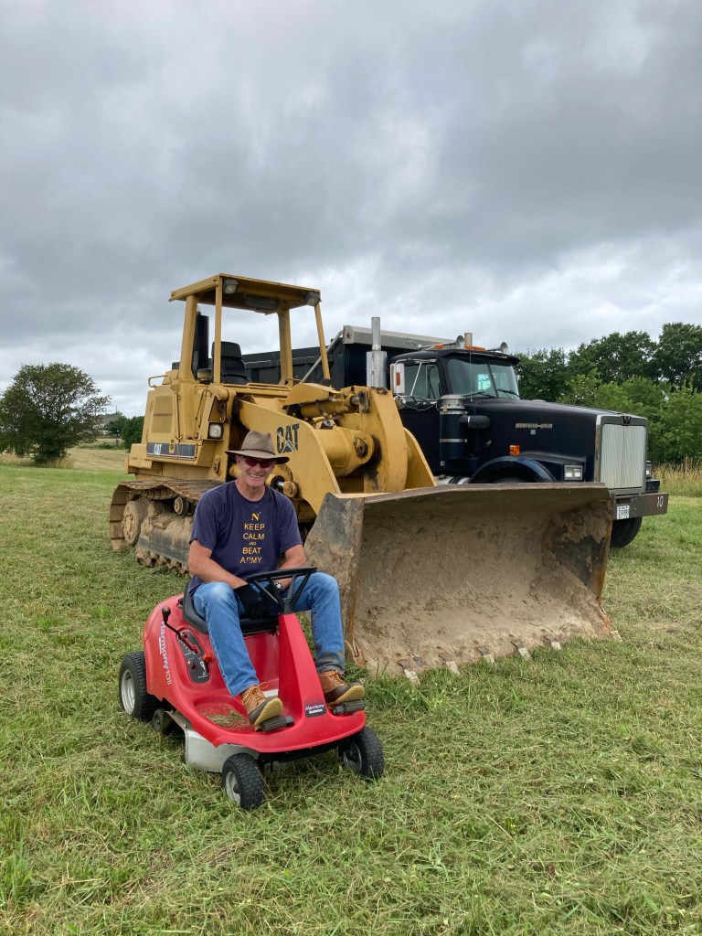 While mowing, my excavator Doug, showed up to drop off some additional heavy equipment needed to finish the road. I think he got a chuckle seeing me on my tiny mower, which was significantly smaller than the machinery he uses on a daily basis. His wife was with him and must have felt sorry for me, because shortly after they departed, Doug returned yet again with more equipment. He explained that after they had left, his wife had asked the leading question: “You’re gonna go back and help him, right?” There was only one answer to that question, so when I saw his truck approaching from the corner of my eye, I was pleasantly surprised to see that this time he was towing a large, commercial grade zero-turn mower that he promptly mounted to join me in finishing the mowing job. With his help, the job was quickly completed and Doug decided to spend the rest of the weekend grading the site and moving dirt to top the road base that had been established earlier in the month.