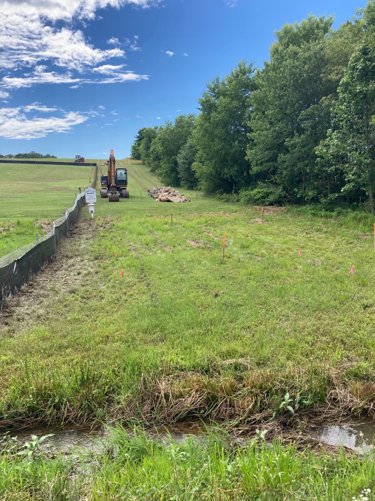 Fortunately, we have one of the best excavators in the state who devised a plan of attack to build the road by approaching from the high ground, then systematically placing large chunks of concrete aggregate across the saturated ground. The work of establishing a solid foundation was completed early in the month, but then a record setting rainfall caused a delay in finishing the road.