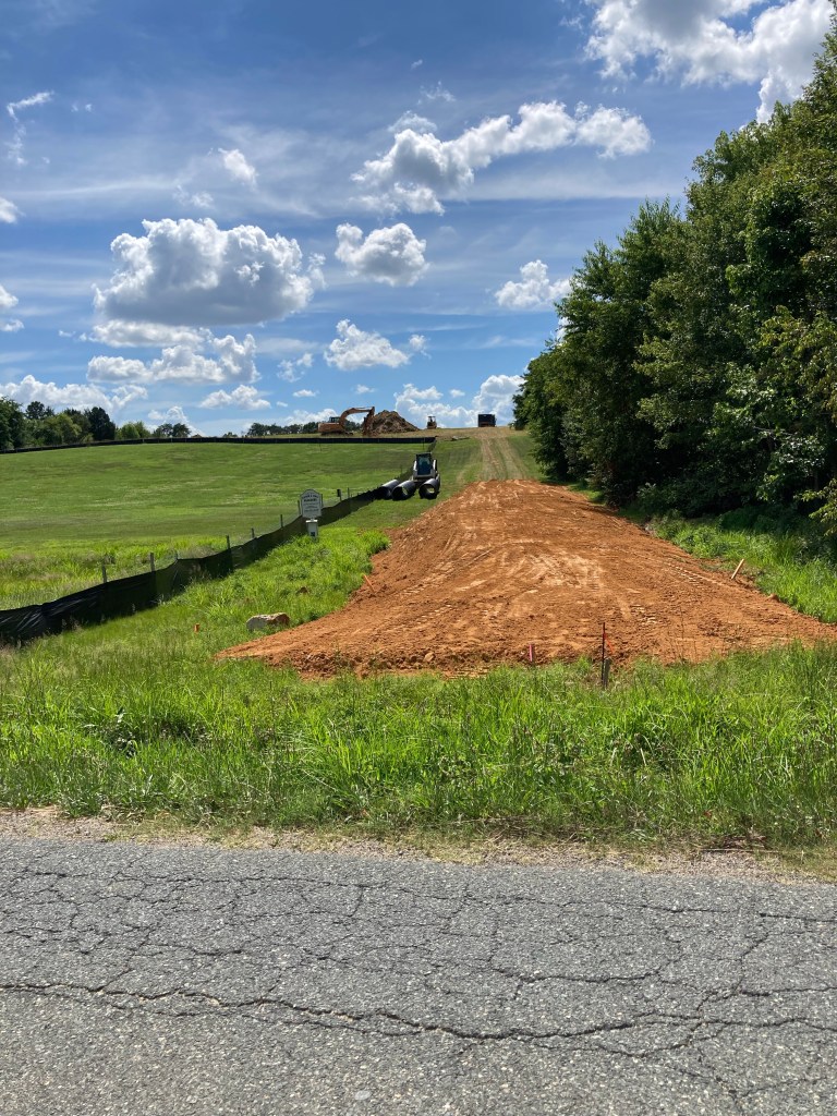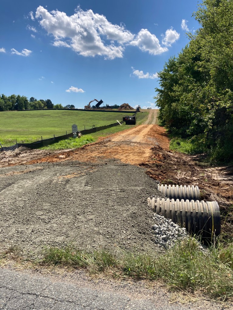 Over a two day period, truckloads of soil were dumped, spread and compacted and the culvert pipes were placed, resulting in a level surface that will be able to support all of the heavy construction vehicles to come. Now that there is a direct access to the house site, I think things will begin to move at a faster clip. Stay tuned for the next update…