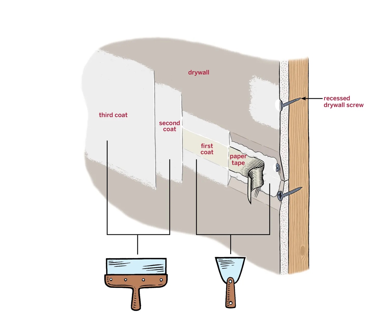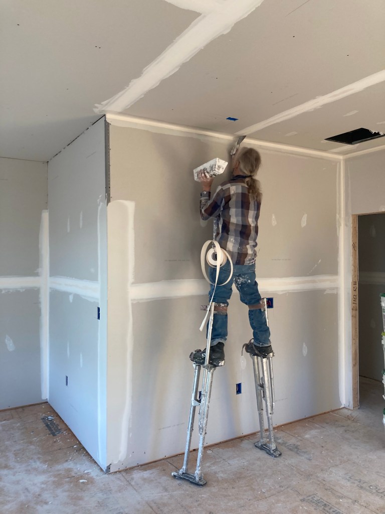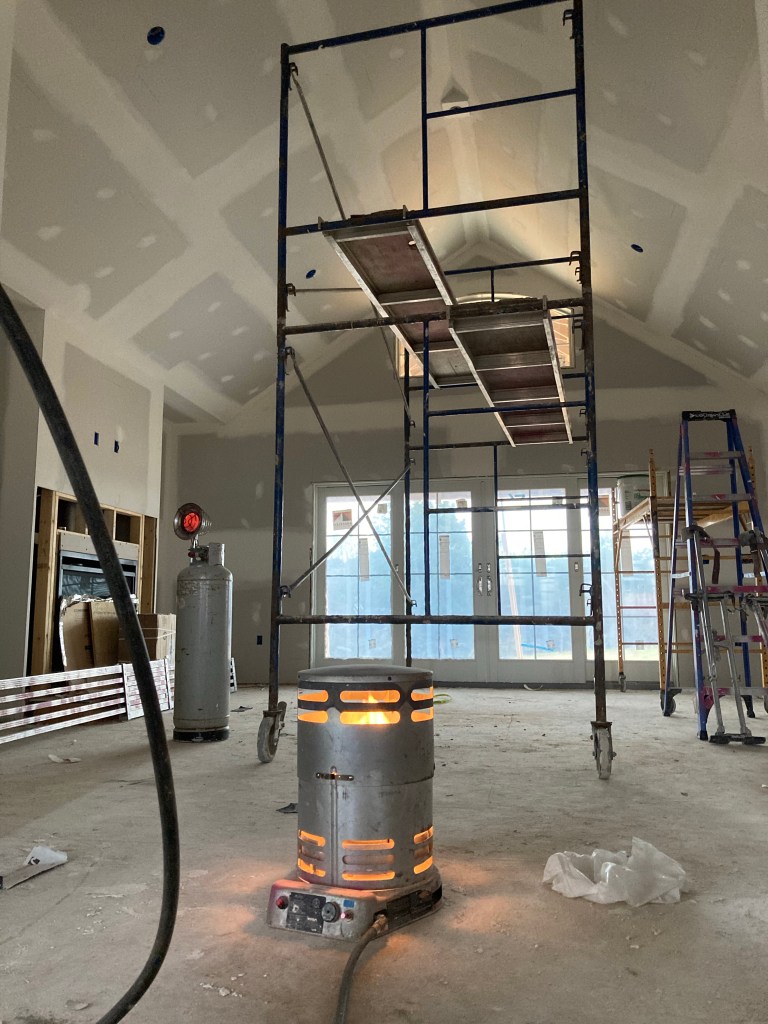 Back on the inside, the multi-step drywall finishing process was beginning. Given the high ceilings and the size of the house, this took about two weeks for the two-man team of brothers Pat and Mike to complete. Since there is no electricity to the house, and a heat source is needed to allow the drywall compound to cure properly, kerosene heaters were used to condition the space. In order to create a seamless, uniform surface for paint, there are several steps. The first is to apply joint compound (aka “mud”) between each panel of drywall and over all of the screw heads. Then drywall tape is applied, followed by the first of three coats of mud. Once dry, the first coat is sanded to create a smooth surface for the subsequent wider and thinner 2nd and 3rd coats. Then everything was finish-sanded, resulting in a smooth, uniform surface throughout the house with no visible seams that is ready to be painted.