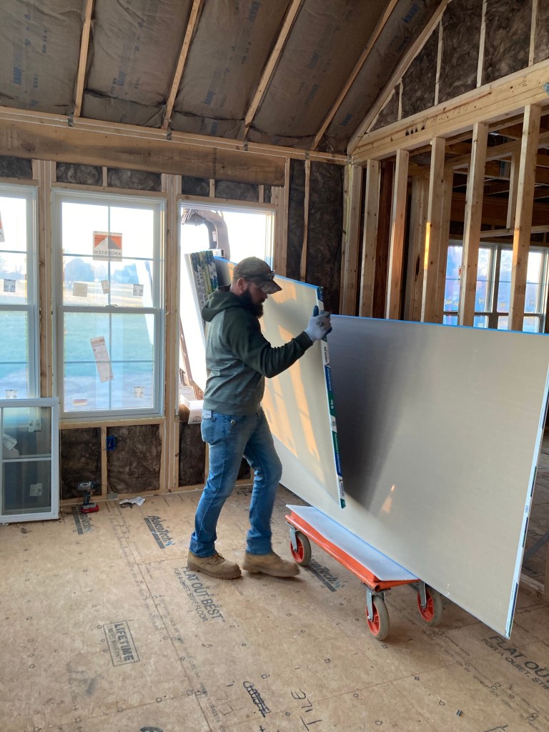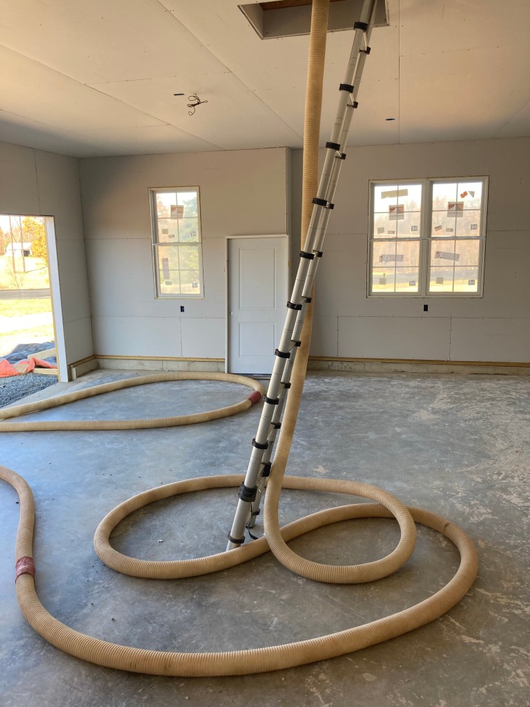 This “end phase” began with the delivery of the drywall. Since the panels are large, heavy, and a bit unwieldy, they were pre-positioned inside the house rather than simply delivered into the garage. Due to the configuration of the house, the panels were offloaded from the truck through one of the windows in the sun room, from there they could be easily placed throughout the house for the installers. Over the course of about one week, the panels were installed and the real “feel” of the house began to emerge with the various halls and rooms now defined by real walls. After the ceiling panels were installed, the insulators returned to “blow in” a thick layer of insulation above the ceiling via the attic access.