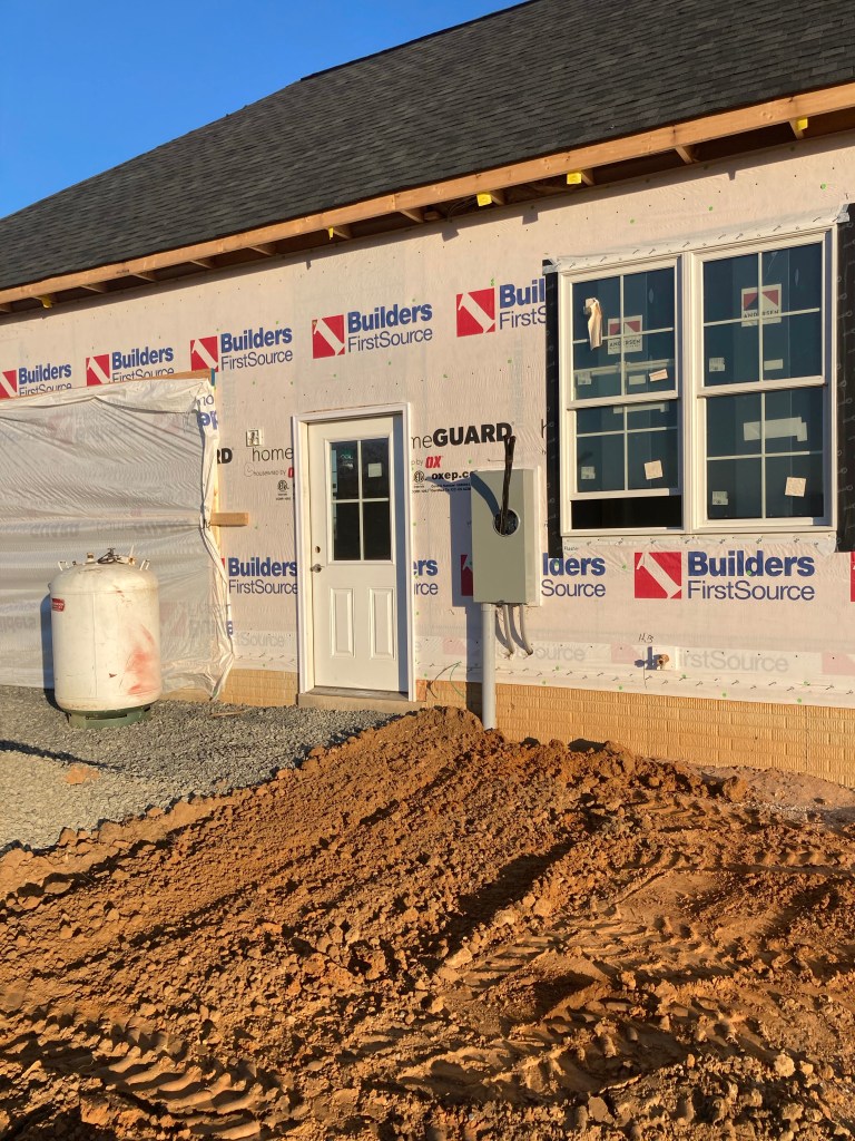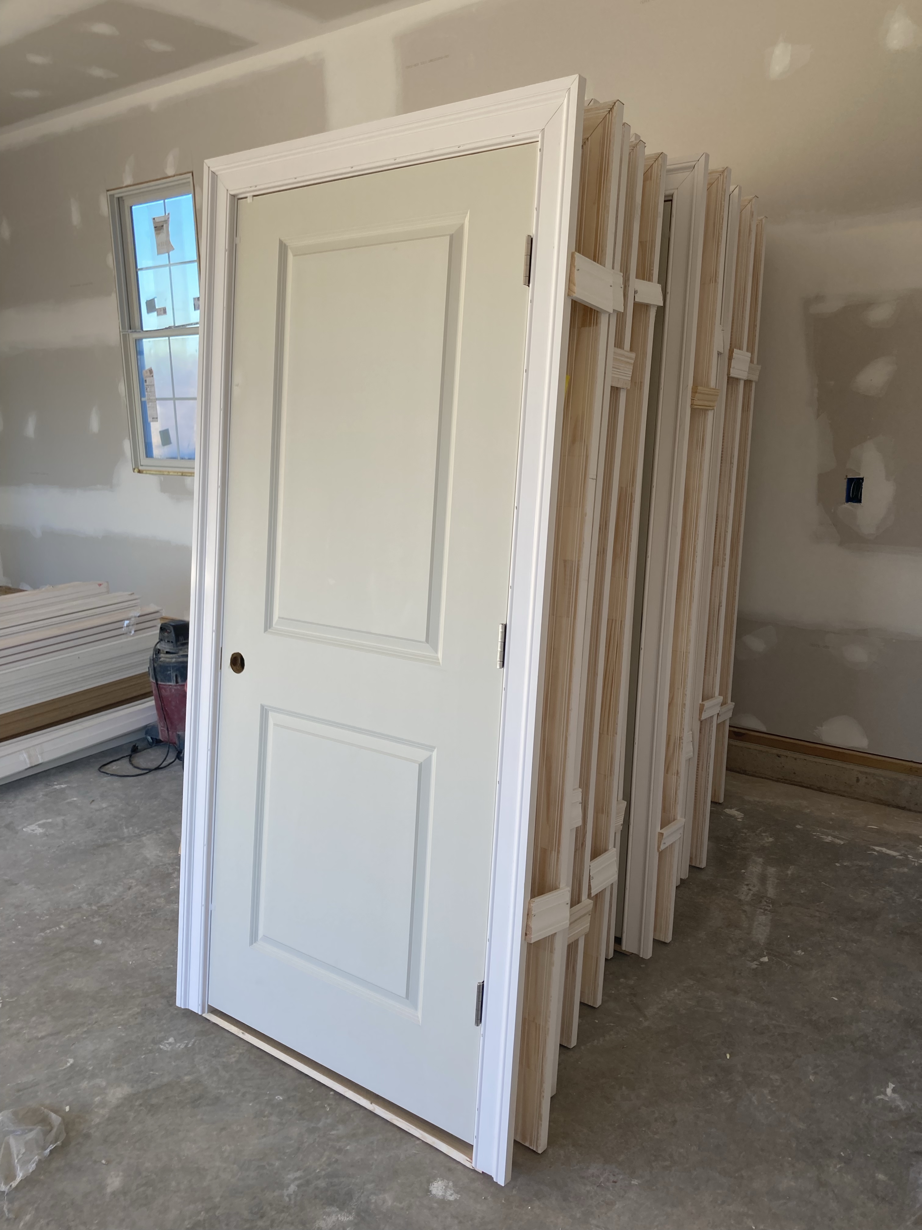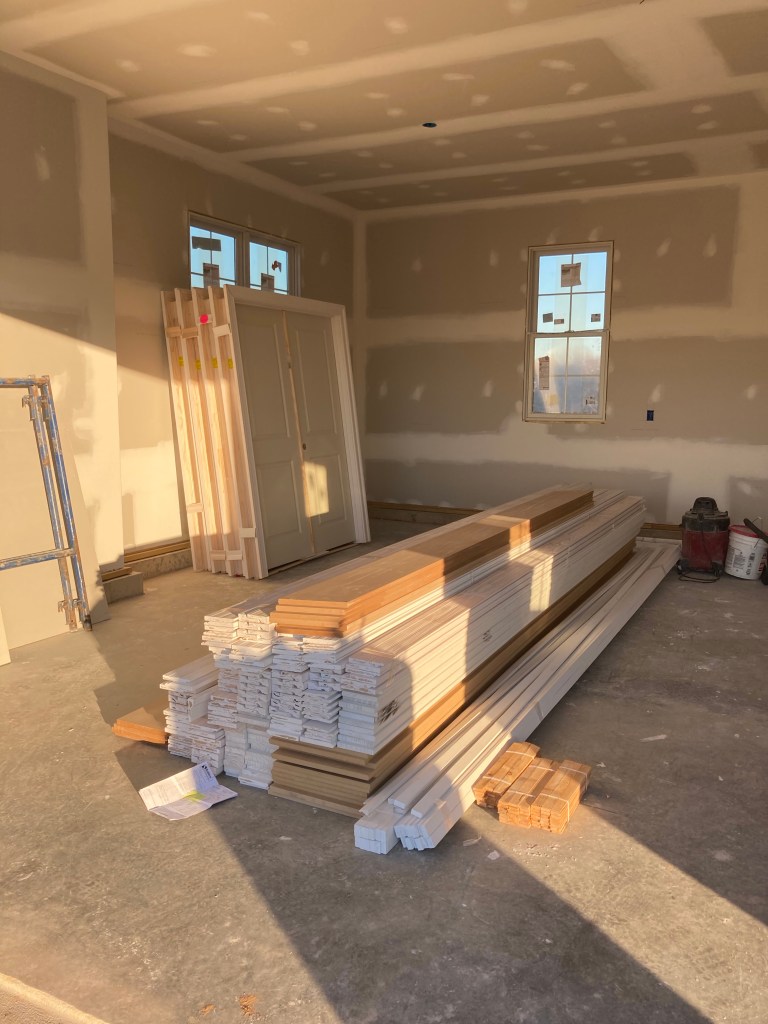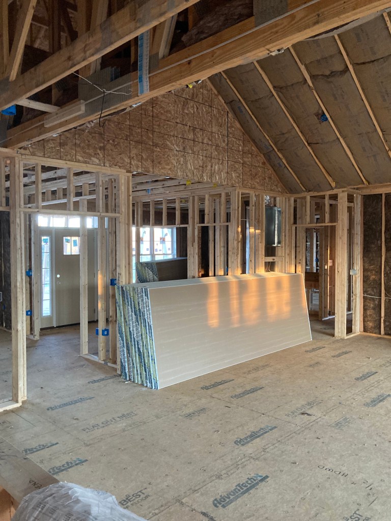 Soon after Pat and Mike finished their work, all the interior trim materials (base and crown molding, door trim and interior doors) were delivered to the garage, staged for the trim carpenter to begin his work. In the coming weeks all the interior trim will be installed, including: built-in cabinets and bookcases next to the living room fireplace; cubbies and a bench in the mud room; and pantry and closet shelves. We are definitely looking forward to seeing some of the personal touches that will transform the interior space from bare walls to some of the elements that add character to the home.