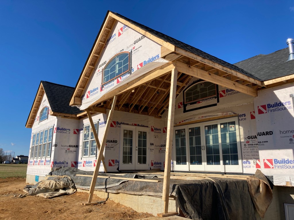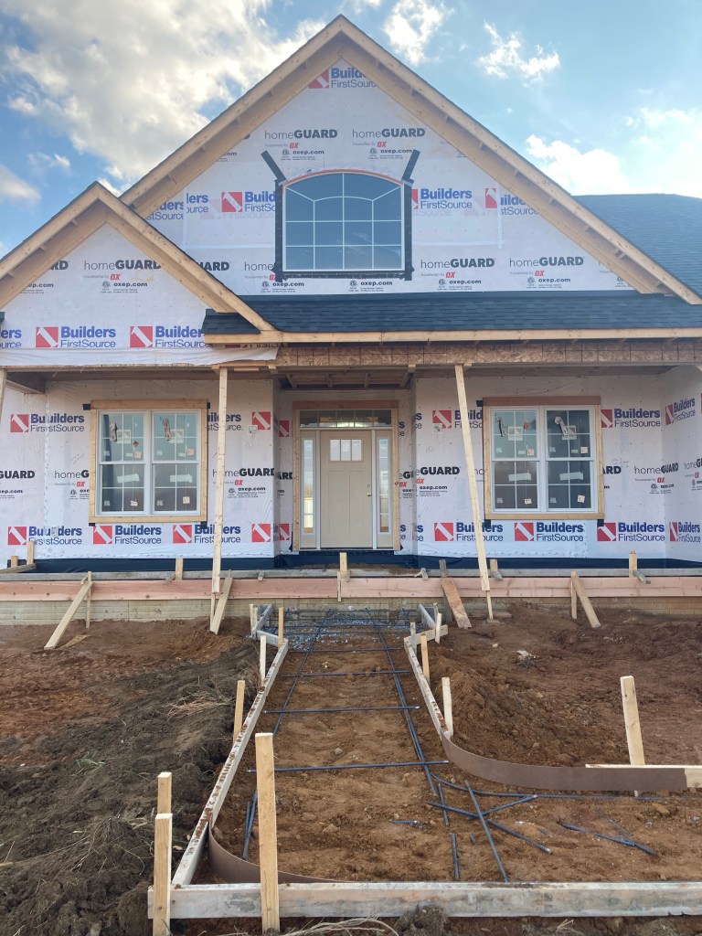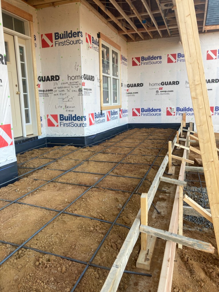 Meanwhile, some prep work began outside to get ready to pour concrete for the front and back porches, and sidewalk. Once the forms were set and the reinforcing rebar placed, the concrete trucks arrived to pour the porches and walkways.