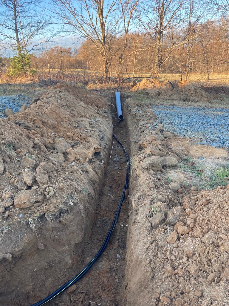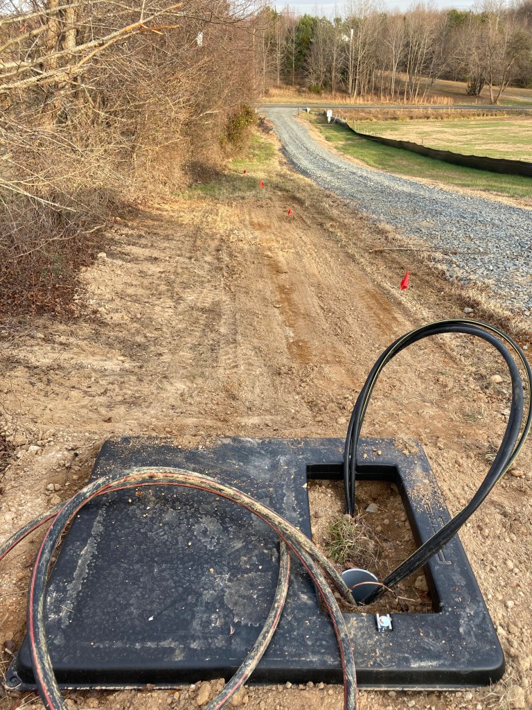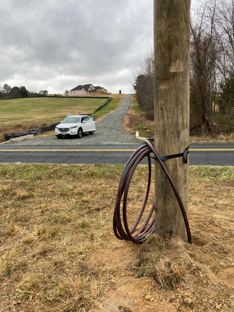 A couple weeks later, the power company returned to install a new power pole along the roadside and, using a horizontal directional drill, tunneled the 7200 volt distribution line from the roadside pole to the transformer location. The horizontal drilling technique used a high-pressure water drill to tunnel under the road and along the driveway to the location of the transformer. As the water drill is doing it’s work, the distribution line and the ground wire that originates at the power pole are threaded through the underground path to the transformer location. When the transformer arrives, hopefully in about 2 months, it will be connected to the buried lines. Its purpose is to reduce 7200 volts from the distribution line down to the 240 volt service for the house.
