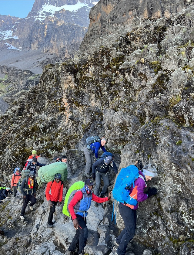 Once again we awoke to a clear sky and mild temperatures despite the nearly 13,000’ elevation of Barranco Camp. Today was a relatively short day, although there were some significant challenges. Directly after breakfast we descended about 200’ to the bottom of the Barranco Wall, a 984’ rock wall with a steeply ascending rocky trail. Nicknamed the “Breakfast Wall” due to the fact that it is the first thing encountered on the trail between Barranco and Karanga Camps, it is a slightly technical climb that requires both hands and strong legs to span some of the more treacherous sections. Fortunately our four guides watched over us like hawks and lent assistance with a hand hold or foot placement when needed.