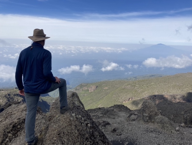 Once we successfully scaled the wall, we enjoyed a well deserved break with phenomenal views of the clouds below us from our perch at 13,900’. Downslope from us lies the Karanga Valley which funnels water from Kilimanjaro to the farms far below. Since our next camp is at 13,156’ we were all under the impression that the remaining miles would be a gentle downhill walk. But alas we were wrong, instead we “enjoyed” the opportunity to go steeply downhill, then steeply uphill… twice!