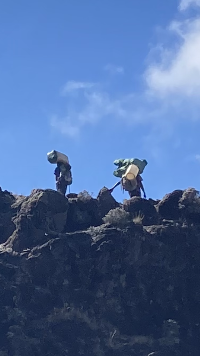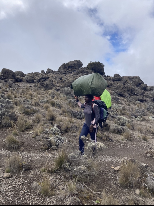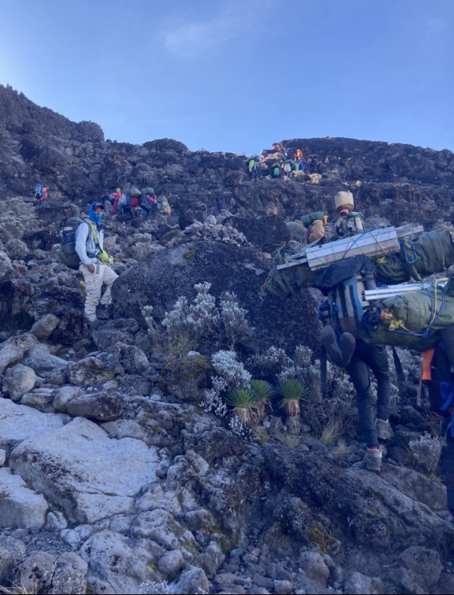 With so many different trekking companies offering treks, there are hundreds of people on the mountain. Making all of this possible are the amazing porters who carry absolutely everything needed to operate these temporary camps. Every day they travel up and down the same trails we are traversing. It is quite humbling, but greatly appreciated, to see these incredibly hard working men and women carry the large, heavy, unwieldy loads on their backs, and often balanced on their heads. They truly are the heroes of Kilimanjaro, for without them none of this amazing experience would be possible.