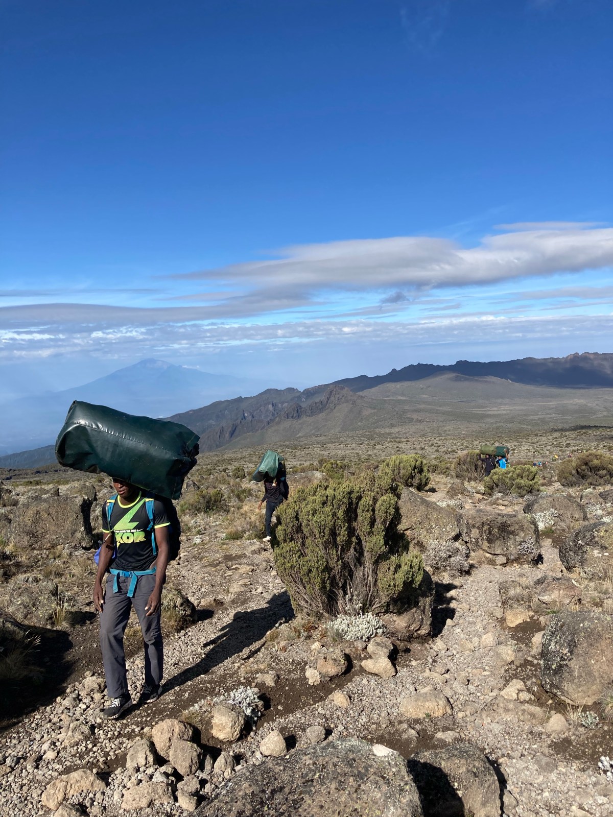 With so many different trekking companies offering treks, there are hundreds of people on the mountain. Making all of this possible are the amazing porters who carry absolutely everything needed to operate these temporary camps. Every day they travel up and down the same trails we are traversing. It is quite humbling, but greatly appreciated, to see these incredibly hard working men and women carry the large, heavy, unwieldy loads on their backs, and often balanced on their heads. They truly are the heroes of Kilimanjaro, for without them none of this amazing experience would be possible.
