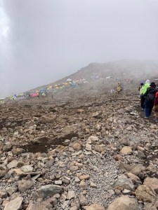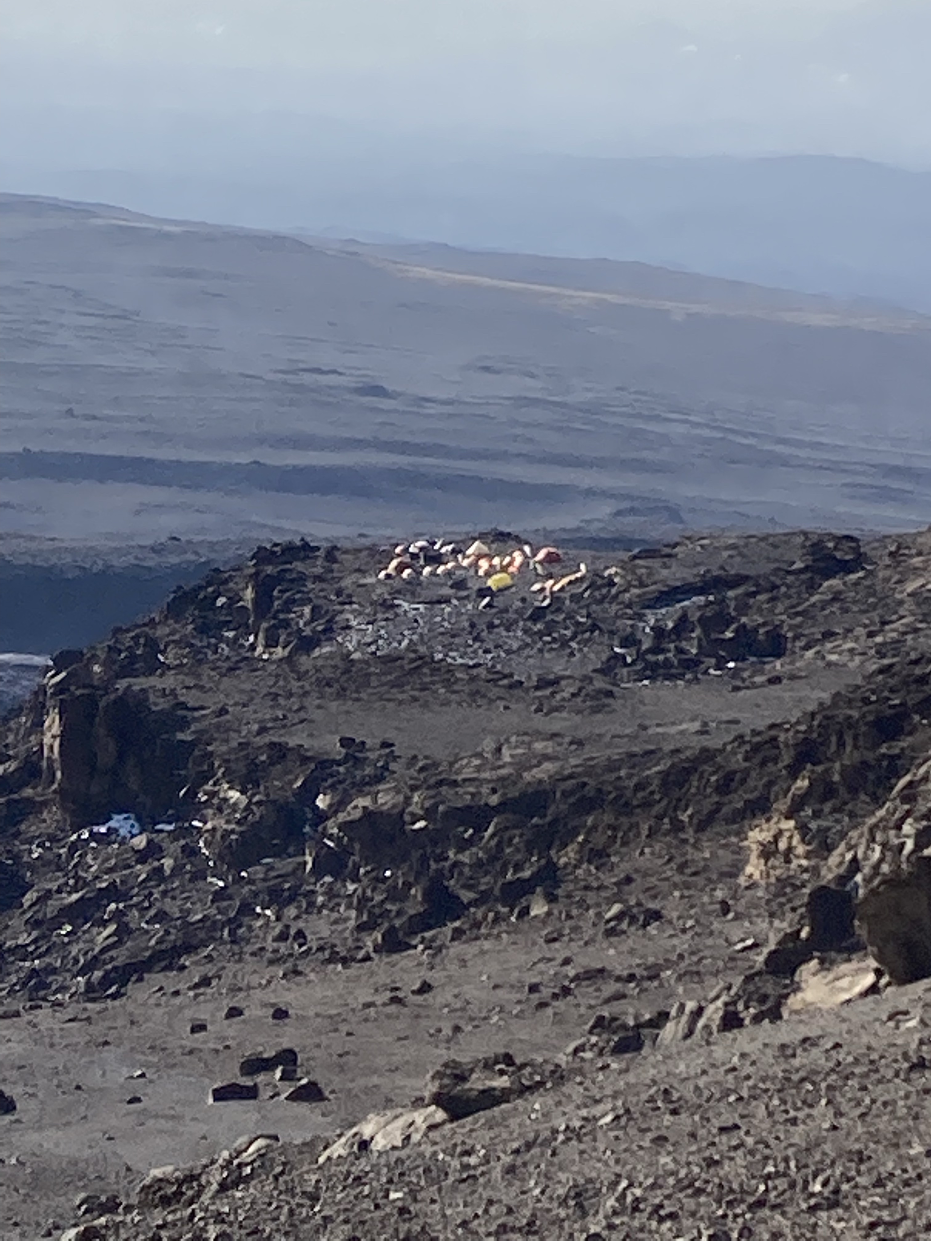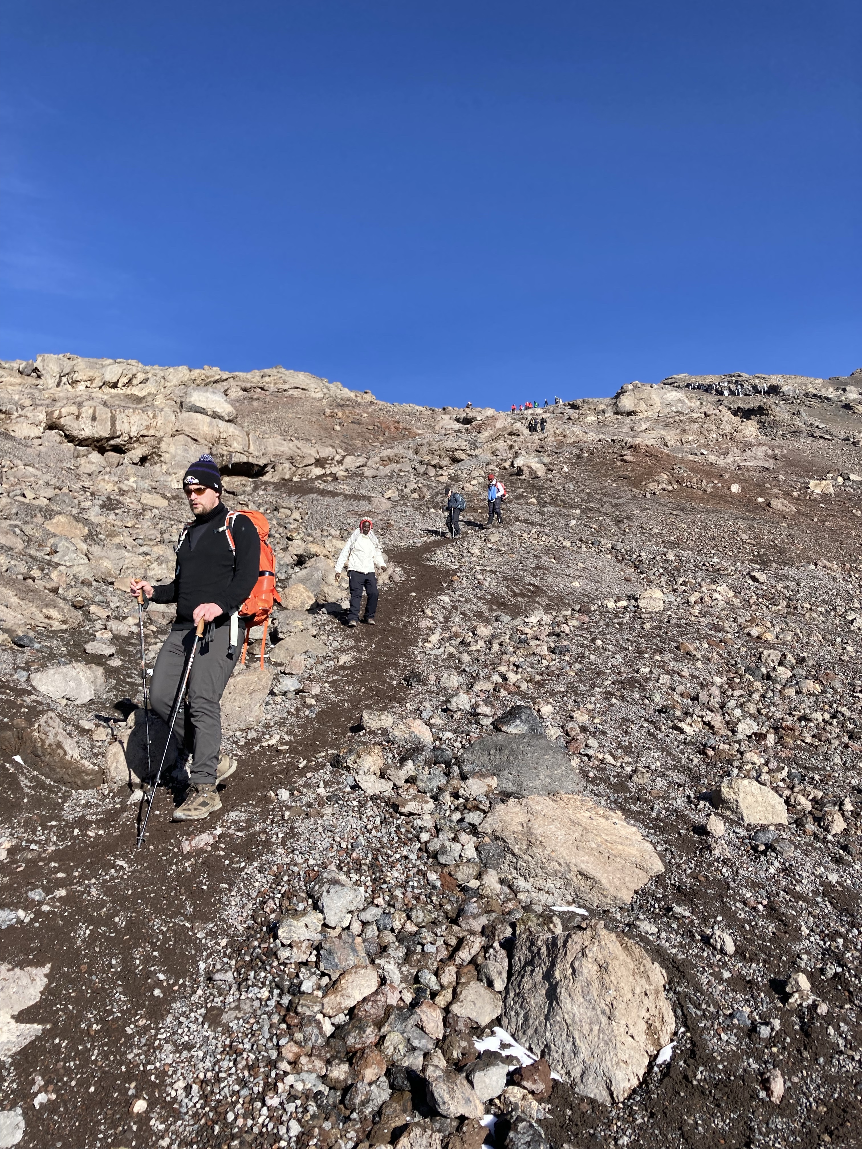 This was not an easy descent… we were all tired, but the main challenge was the trail. Kosovo Camp lies in the Alpine Desert Zone where the steep trail is mostly comprised of uneven rock and sections of hardened lava the looked like very rough concrete. As we descended through Barafu Camp, which was located about 700’ below our camp, we were thankful that our day hadn’t begun there. First it would have added a very hard additional hour for the summit. Secondly, the camp was large and crowded, located in a steep, rocky area that probably spanned at least 500’ of elevation change from top to bottom. As we descended, we passed large groups of trekkers on their way up, who would be stopping for the night at this rugged outpost to begin their own attempts for the summit later in the night. We passed along our best wishes as they congratulated us on our achievement.