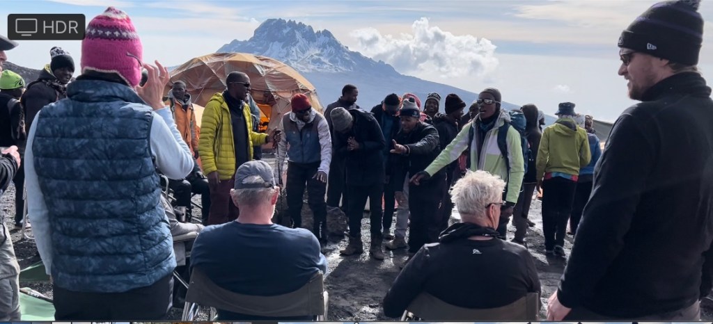 The first part of summit day occurred from midnight to 6:00 a.m., the time we reached Uhuru Peak, the summit of Kilimanjaro. Now it was time for the long descent. First, from the summit back to Kosovo Camp, our starting point for the day. When we entered camp, we were greeted by the entire Ian Taylor Trekking Team with an uplifting and spirited series of songs to celebrate our successful summit.