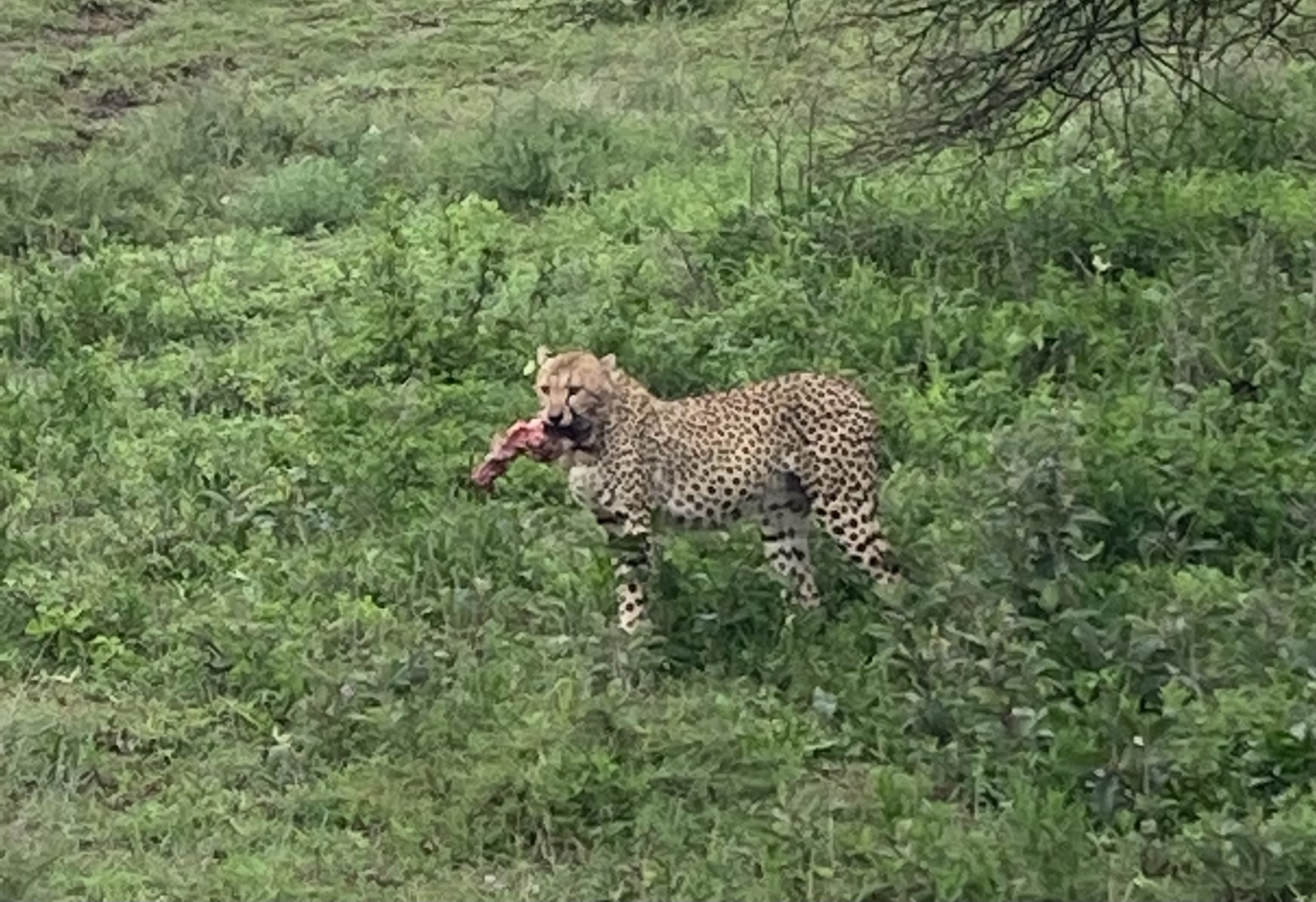 After a wonderful breakfast, we loaded up the vehicles to begin our explorations for the day. Within 15 minutes we sight a large group of 15 vehicles arranged in a circle. Our two vehicles join the circle and we are rewarded with the sight of three cheetah consuming a fresh wildebeest kill. It is fascinating to see the circle of life play out in front of our eyes. After observing for about 45 minutes, we continue on. Very shortly we spy another trio of cheetah enjoying their own wildebeest while several vultures waited patiently in the nearby Acacia trees for their turn at the scraps.