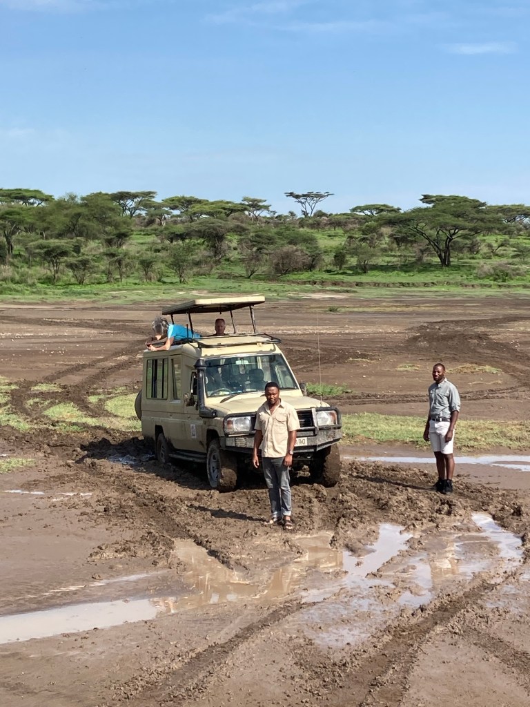 We spent our first of two nights at a tent camp on the Serengeti. This was a small encampment with 10 large tents, 6 for guests, and one each for dining, kitchen, camp staff, and safari guides. Our first night was restful with the sounds of various nocturnal animals nearby. Interestingly, the camp staff includes a Masai warrior who stays up all night to protect the camp. A heavy rain fell throughout the night, so the large safari land cruisers will definitely be needed to travel through the muddy savannah.
