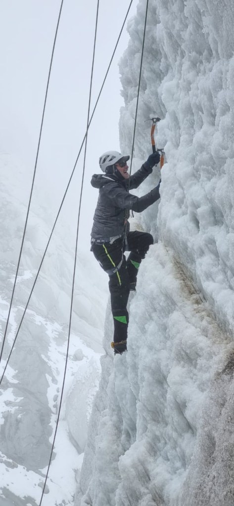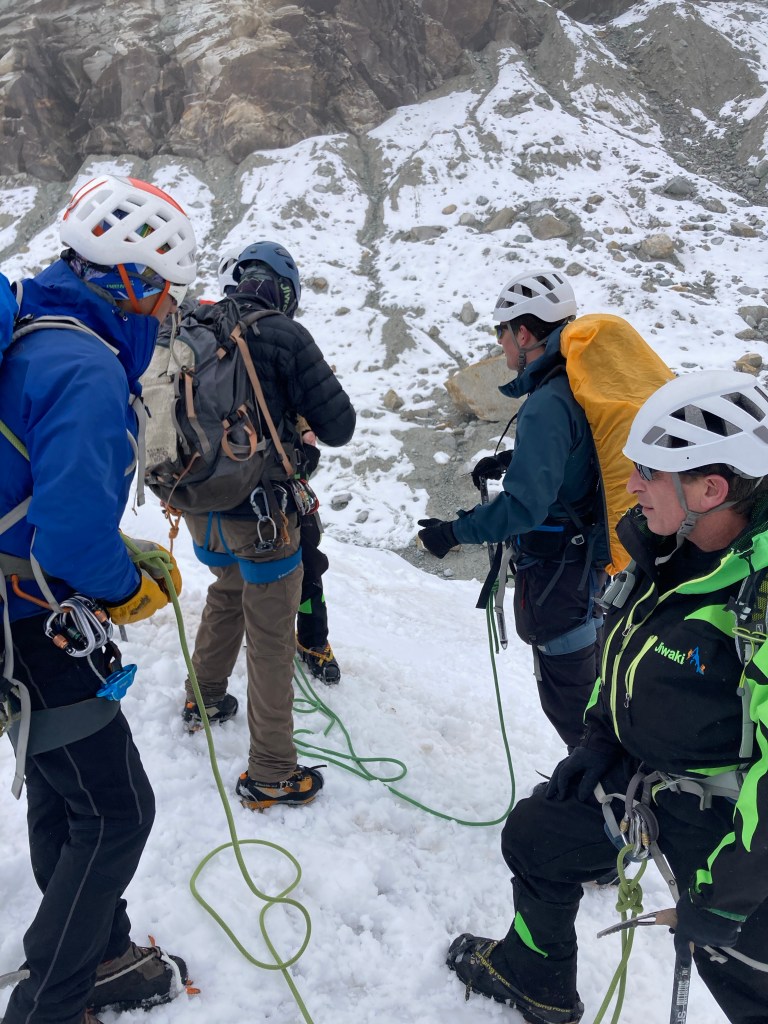 Although I have climbed with crampons and an ice-axe, I have never scaled a vertical wall of ice. Today we got to do just that. After William ascended and set the climbing rope, each of us got a chance to climb the 40’ vertical wall of ice. Harnessed in, we used two ice-axes to get solid holds before kicking our crampon’s into the ice. After testing the hold, we slowly used the technique to ascend the wall. Between the elevation, exertion, and nerves, this was hard work. Ultimately we all reached the top then enjoyed a short rappel back down. This was definitely an experience to remember!