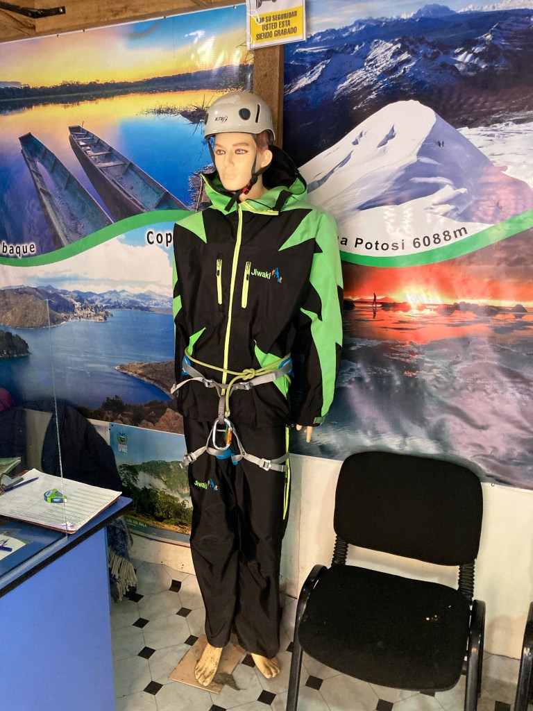 In the drive up, we stopped on the outskirts of La Paz and were measured for and issued our climbing kit, which included an ice-axe, crampons, harness, helmet, and snow boots.
