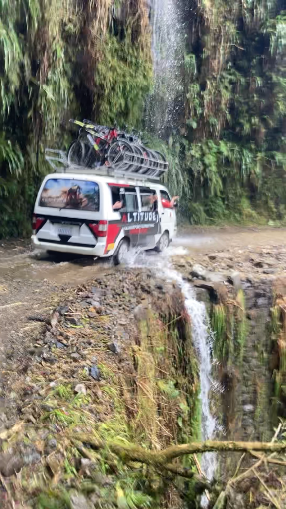 Riding down the road was a thrilling experience, full of speed, adrenaline, and the jarring sensation of vibrations from the rough road translated through the full suspension bike frame to our bodies. The equipment was top notch, adding to our confidence that the bike could absorb the most punishing parts of the very rough road, and we could easily control our speed with the well-maintained disc brakes.