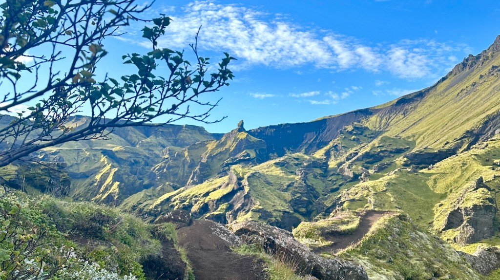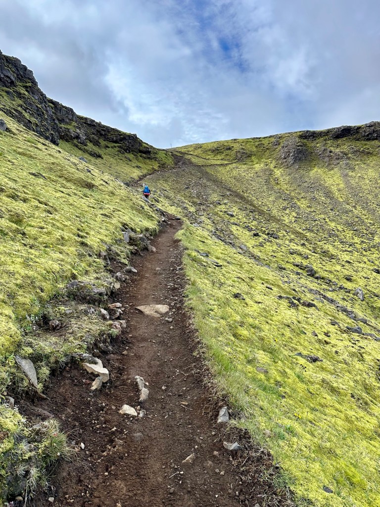 And so… our long final day of hiking begins at 7:30 am as we hit the trail. Although we start in a flat area along the Krossá River, the trail quickly turns away from the river valley as we begin a very steep climbing section that will have us gaining 3,330’ (1,000 m) in just 4.5 mi (7.2 km). The first portion of the climb passes through a lush green landscape blanketed with trees, shrubs and grasses. The terrain is dramatically carved, revealing its relative young age in geologic timescales.