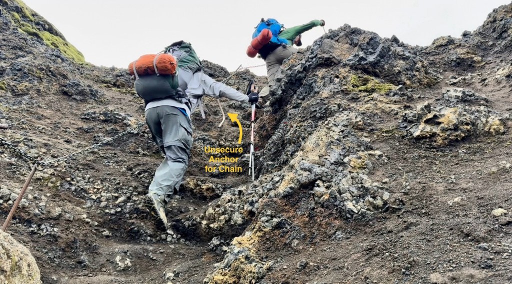 In this section, some chains had been installed to provide a handhold, but in some places the rebar anchoring the chain railing was completely torn from the ground, so we were prudent to not trust our lives on that precarious single handhold.