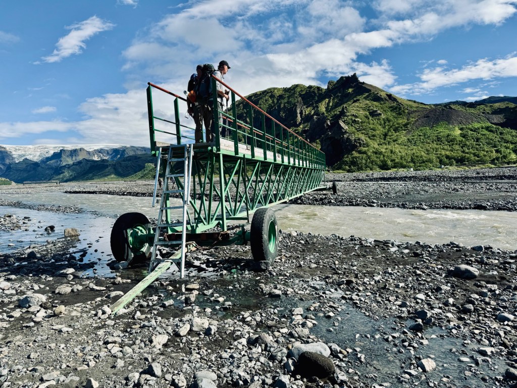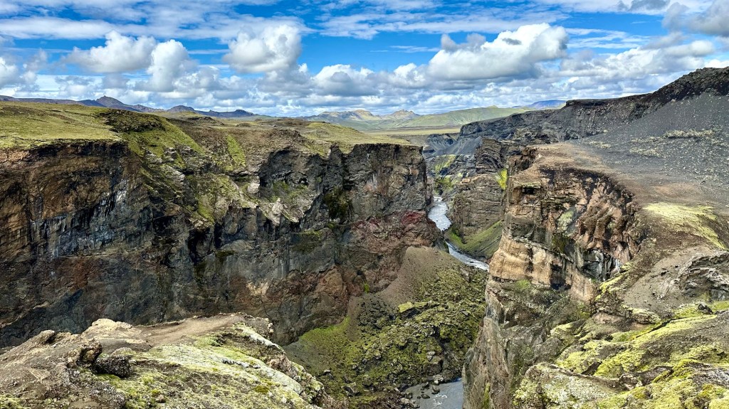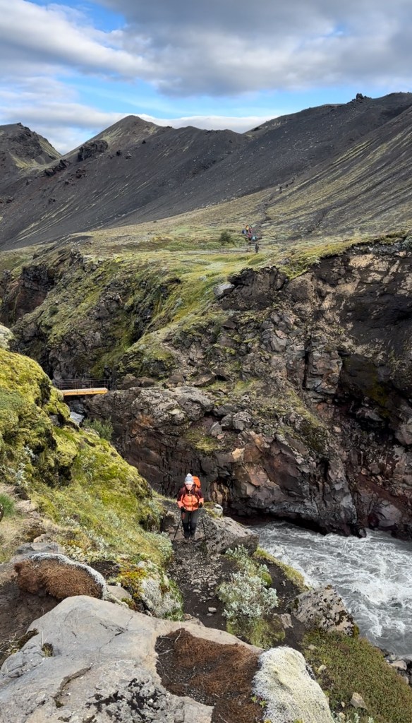 Once again the terrain proved to be the star. Today started on a black sand trail that allowed just enough cushioning for our less than supple bodies. We descended into the very narrow and steep section of the upper part of the Markarfljótsgljúfur Canyon, across a bridge over what appeared to be class 6 rapids originating from the melt from the Mýrdalsjökulla Glacier a few miles to the east.