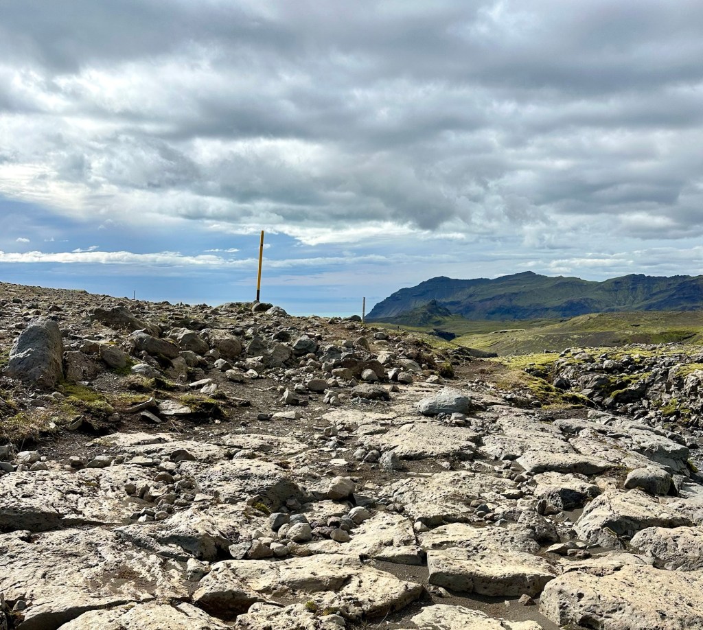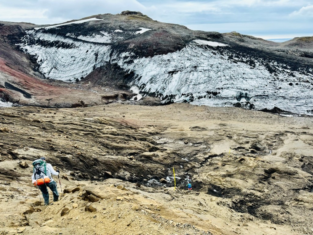Finally, having reached the top of the steepest climbing sections, we are near the highest elevation of this multi-day adventure. As the terrain flattens in front of us, we are very close to the Eyjafjallajökull glacier on our left and the Mýrdalsjökull glacier to our right. What we didn’t know at this point was that the next 2.3 mi (4.2km) to the Baldvinsskáli Hut would be some of the toughest hiking any of us had ever done.