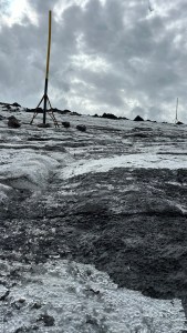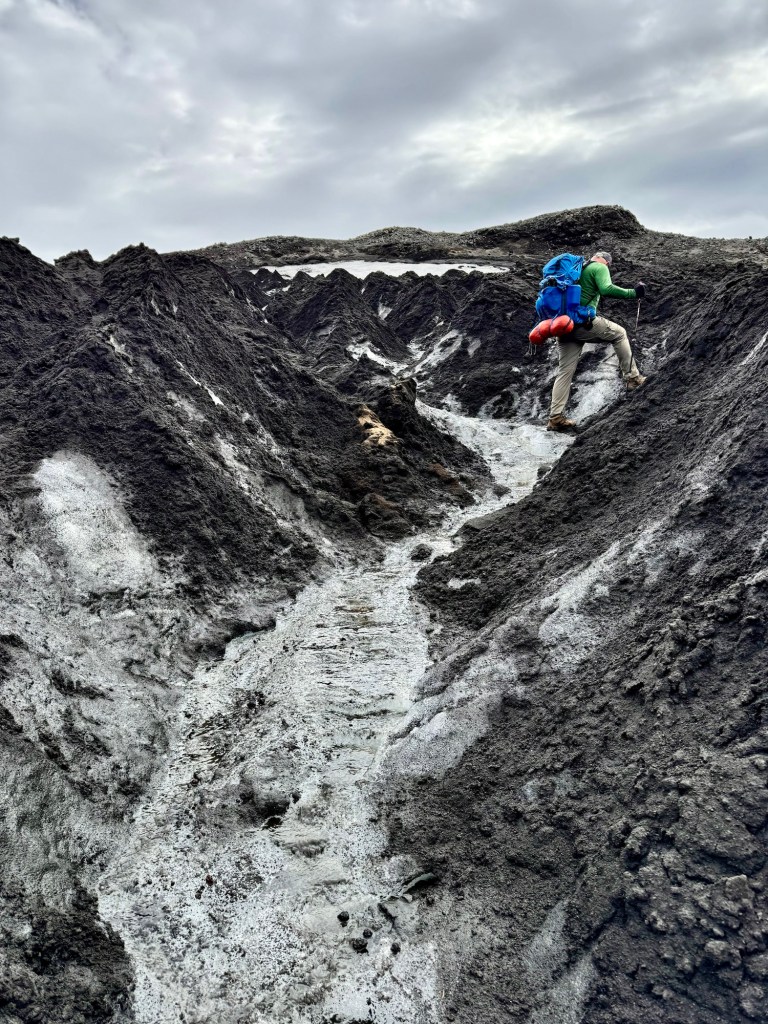 After about 45 minutes, we finally made it across the lava rock for a brief section of soft volcanic sand. Our respite, however, was to be short-lived because the next section required us to descend down the steep side of a glacial moraine, then cross over a series of 6 to 8 feet high sharp ice ridges covered by black volcanic cinder. In some cases we had to make multiple attempts to get an adequate foothold to get up one side only to slide down the opposite side. Our trekking poles were of little help since they couldn’t pierce the hard glacial ice.
