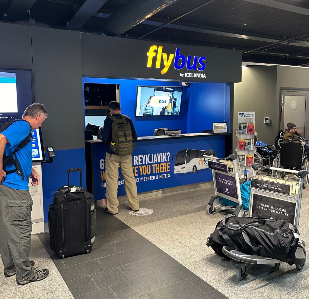 Phil and Chris getting bus tickets from the airport into Reykjavík