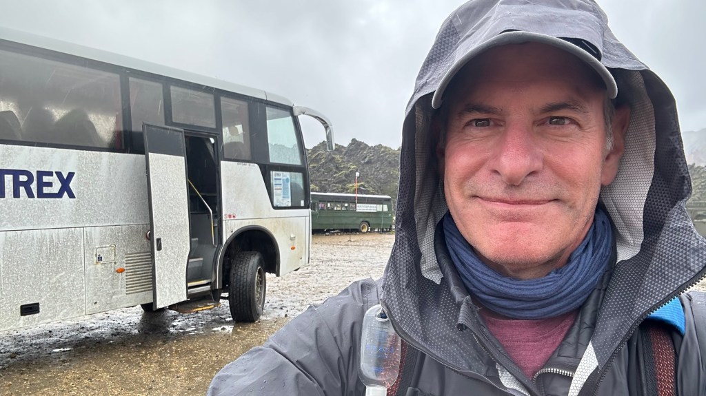 In the intervening months we invited another friend, Phil, and began planning in earnest. Fast forward to mid-August 2024, and all the planning and coordination has been completed. Early in the morning of 15 August, the three of us, bleary-eyed from an overnight flight, landed in Keflavik. Although the airport is located well outside of Iceland’s capital of Reykjavík, it was very easy to find bus transport for the 45 minute trip into the city where we would catch our afternoon bus to the Laugavegur trailhead at Landmannalaugar.