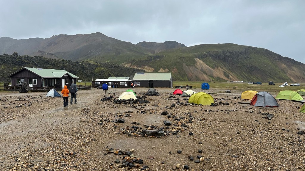 Our original plan was to get to Landmannalaugar and immediately begin our hike to the next campsite at Hrafntinusker, about 12 km (6.4 mi) away. Due to the wind and rain, we instead decided to camp at the Landmannalaugar trailhead. After paying for a tent site, we struggled to quickly erect our tents to avoid getting more wet than we already were. The entire camp was a muddy mess, so once the tents were ready, it was time to call it a day.