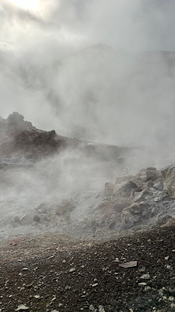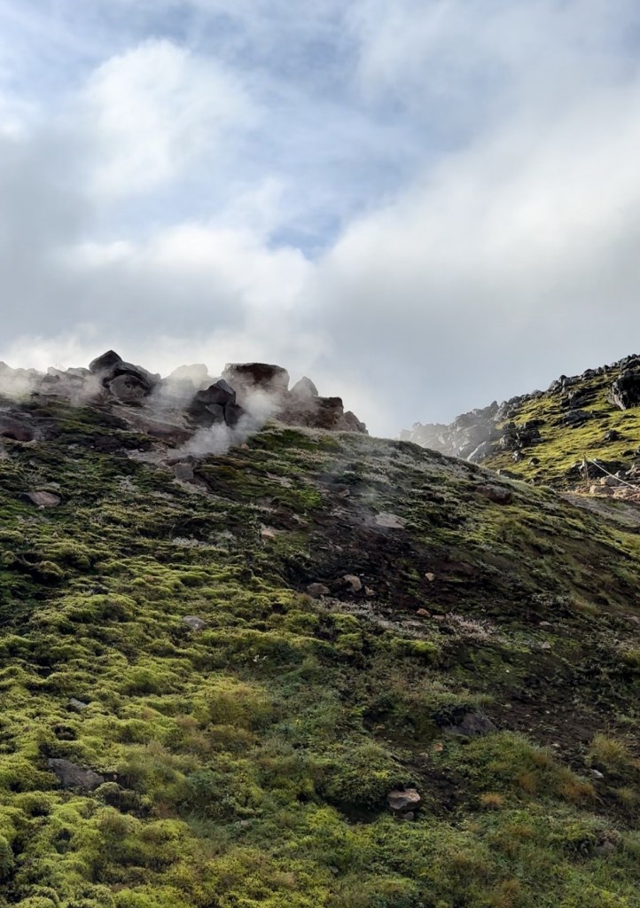As the hike progressed it was quickly apparent that the land around us was alive with geothermal activity. The smell of sulfur was prevalent and all around us plumes of steam rose from holes in the ground called fumaroles. The steam forms when groundwater is heated by magma rock. We even encountered one fumarole that was gushing boiling water!