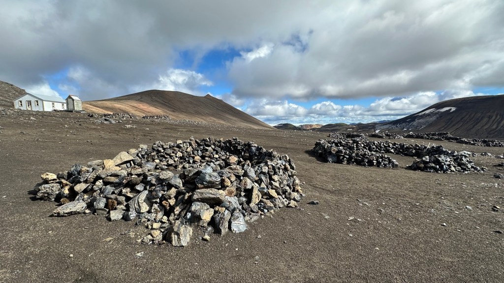 Stacked rock walls at Hrafntinnusker to protect tents from punishing winds at elevation