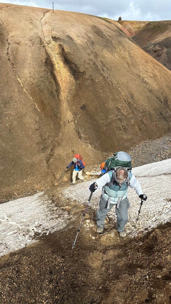 After a warm breakfast prepared over our camp stoves, we broke down our tents, repacked our gear, and began our long day with a nice uphill climb out of Landmannalaugar. We beat the rush out to the trail and enjoyed the solitude of having the trail to ourselves for awhile.