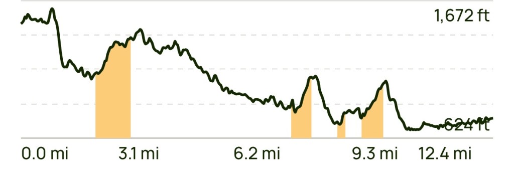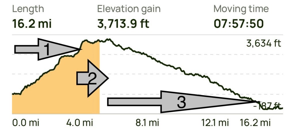 Although the overall trail profile shows that we will be descending gradually over the course day, we still expect to encounter some sections with sharp climbs and steep descents. Although counterintuitive, the climbs are preferred over the descents.