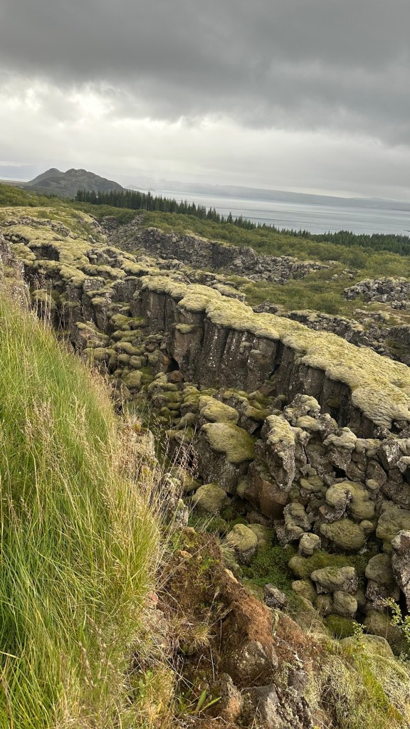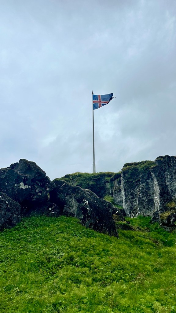 Our first stop was Þingvellir National Park, a UNESCO World Heritage Site. The park straddles the area where the North American and Eurasian tectonic plates meet, so interestingly we were on two different continents in the span of a few minutes of driving. This site is was also the location of the first Icelandic Parliament, the Lögretta (Law Council) that met annually from 930 to 1262 to make laws, resolve disputes, and recite laws from memory to the assembly from the Lögberg (Law Rock).