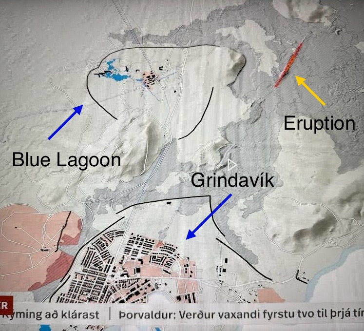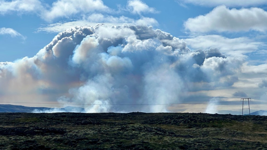 Finally it was time to say goodbye to Iceland. We dutifully hiked back to the main bus terminal for our FlyBus back to the airport. Along the way we were hoping to get a glimpse of of the volcanic eruption that disrupted our Blue Lagoon plans, perhaps some solace for the lost opportunity. Luckily we were seated in a prime location on the bus to see the area of the eruption as we approached the airport. Amazingly I was even able to capture a reasonably good picture through the window of the moving bus… a final indelible memory from the “Land of Fire and Ice.“