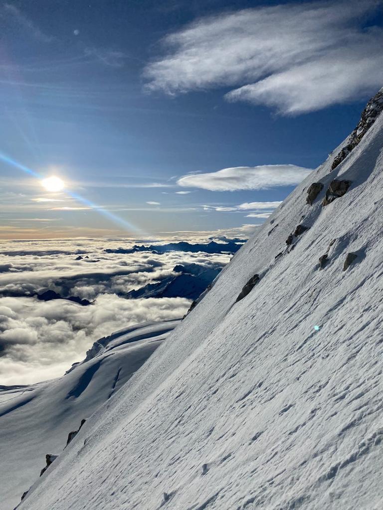 Above us, high on the summit ridge Ovidéo, who was climbing with Tom had assumed trailblazing duties on the toughest section of the climb, the final 175 meters to the summit on a 45-50 degree slope. He plowed through knee-deep snow all the way to the summit, a truly Herculean effort.