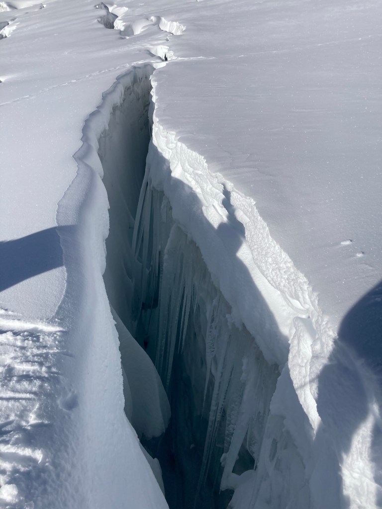 On the way down the importance of being roped and harnessed together was underscored. While ascending, our guide William was in the lead, Ron center and me at the rear. While descending we went in reverse order. When crossing a 3’ crevasse, William would put tension on the line to assist our momentum while we jumped across.